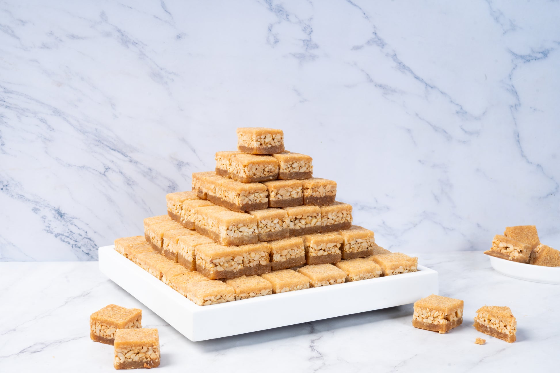 At its heart lies a rich filling of almonds and cashews, blended to create a smooth, satisfying nut centre. The pastry layers are gently bound using a carefully balanced mix of pure ghee and natural date syrup, providing mild sweetness and depth of flavour without relying on refined sugar.